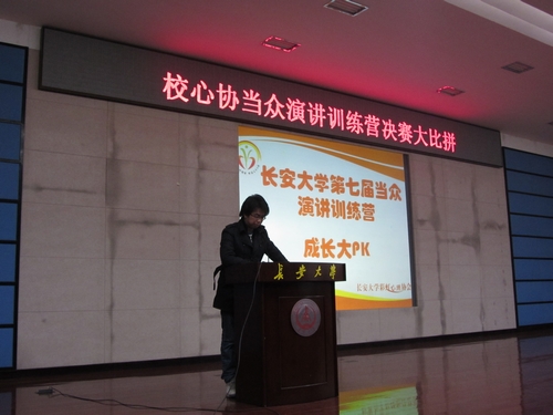 11月12日晚6:30,由长安大学彩虹心理协会主办的第七届当众演讲训练营决赛在会议楼二楼成功举办。校心协原主席兼理事长张志群,原副主席兼副理事长李海燕、刘志伟,原首席秘书长杨骁,现任主席马晓彤,现任副主席李先斌担任了比赛评委,校心协全体人员观看比赛。