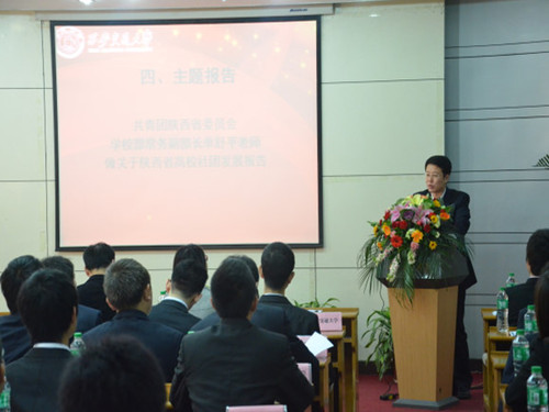 之后,共青团陕西省委员会学校部副部长单舒平老师作了关于陕西省高校社团发展的报告。单部长以“社团的存在价值在何”为起点,指出社团的发展是为了进一步丰富校园文化,弥补第二课堂的不足,并强调高校培养人才是开放的,而不是封闭的。在分析了社团发展的四大瓶颈——思想、人才、环境、经费之后,单部长对社团的发展同样提出四点建议:坚持“双百(百花齐放、百家争鸣)”方针,扩大群众性;坚持“二为(为人民群众服务,为社会主义服务)”方针,强调思想性;坚持分类指导,突出针对性;坚持以人为本,提升社团发展的专业性。
