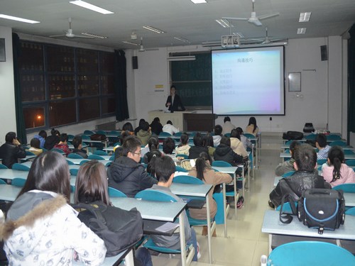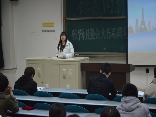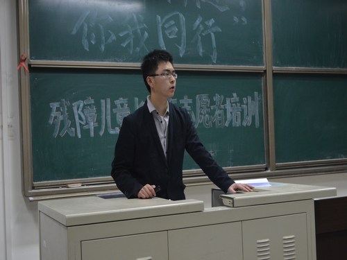 晚7:00,培训会在主持人的介绍中拉开帷幕。首先由青年志愿者服务总队副主席杨立凯作讲解。他罗列出“什么是智障”、“怎样与他们沟通”及“活动意义”等问题,并一一讲解。其中,对智障儿童的认知特点、人格特点、行为模式、语言特点作了说明,要求志愿者与智障儿童建立信任关系,在服务中坚持适度原则以有利于他们的恢复。随后,总队爱心捐赠部部长杨佳又给大家提了一些注意事项。她讲到,这些智障朋友都非常单纯,遇到新朋友会很高兴,希望大家敞开心扉接受他们。另外还提醒志愿者在游湖期间注意安全。最后,政治学院志愿者分队负责人郑文斌介绍了具体活动安排:本次活动将在3月18号本周日展开,当天会有专车接送。智障朋友来到我校,会在校门口合照,游明远湖,喂鱼,参观图书馆,最后到操场活动、做游戏。而如果当天下雨的话,会在最后邀请他们到大学生活动中心观看文艺表演。