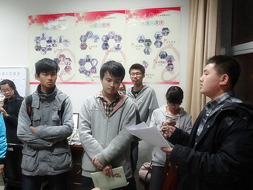 大会首先由组织部副部长赵梦浩做未来两天初赛的工作安排。初赛分为四个赛场,依次为多功能厅、培训室、视听室和会议室。他同时对各个赛场的主持、签到记分员、门迎以及礼仪的相关工作和具体细节也提出了要求。之后,组织部部长陈学蓉和公益实践分会部长刘琦作了进一步的补充,要求所有人员须着正装,并在规定时间到达自己负责的赛场,以积极的态度完成本次活动。最后,副主席刘翱翔作总结发言。他着重强调了本次活动的重要性以及社联一贯的服务态度。他说,我们要注重服务质量,尽最大的努力,投入最大的激情来完成此次活动。