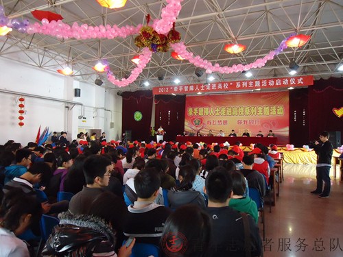 2012年3月25日早上9:00,我校青年志愿者服务总队志愿者代表一行6人赶赴西安科技大学参加2012“牵手智障人士走进高校”系列主题活动的启动仪式。长安大学、西北大学、陕西师范大学、西北政法大学等20所西安高校应邀参加了此次启动仪式。西安市智力残疾人及亲友协会主席扬琪、陕西省残联副理事长戈养年等领导出席了仪式。莲湖区30名智障人士及亲友在此欢聚一堂。