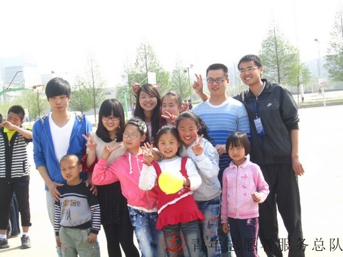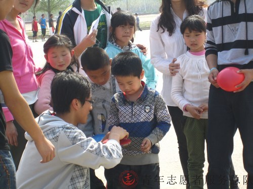 上午8:00,志愿者开始在西区篮球场布置场地,其中一部分志愿者则负责去接孩子们。上午9:00,活动正式开始。在运动会之前,志愿者们为孩子们准备了精彩的节目。他们或舞或唱,现场一片优美的旋律,孩子们纷纷送给正在表演的志愿者气球。其中,又有志愿者表演了双节棍,有的男孩激动地欢呼并在一旁模仿他们的动作。10点左右,主持人宣布趣味运动会正式开始。这次运动会主要是做一些运动性质的小游戏,有海底捞月、双人夹球接力、端乒乓球、搭桥过河、随叫随到等5种比赛。在随叫随到比赛中,由主持人说出一件东西,由分成的4个小组中的一个人听取并跑去告诉本组队员寻找,接着再拿到主持人跟前的盆子里,队员间可以接力。记者注意到,志愿者跟孩子们的关系很亲密,有的互相嬉笑打闹,有的志愿者跟孩子们做小游戏,孩子们都把志愿者当成大哥哥、大姐姐。