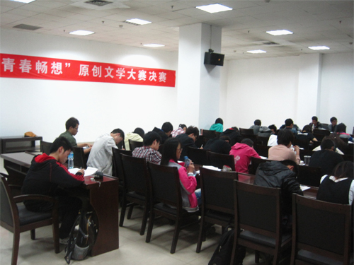 2012年4月15日晚7点,由长安大学学生会图书管理委员会举办的“青春畅想”原创文学大赛决赛于图书馆一楼会议室准时举行。各位参赛选手在工作人员的引导下按序就坐,大赛正式开始。