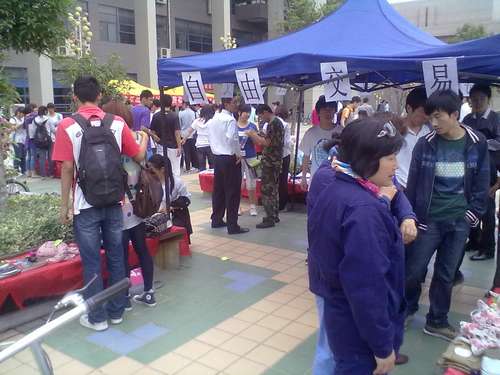 跳蚤市场(flea market)是欧美等西方国家对旧货地毯市场的别称,通常由一个个地摊摊位组成,规模大小不等,所售货物价格非常低廉,仅为新货的10%~30%。今天,长安大学渭水校区也办起了一个规模不小的跳蚤市场。来到展卖现场,映入眼帘的是琳琅满目的商品和各种“淘宝”的顾客,商品种类繁多,大到单车、电脑,小至头饰、指甲油、假睫毛等等,还有各类书籍、服饰鞋帽、各种球拍,一应俱全,应有尽有。本次跳蚤市场办得也相当正规,在展卖现场除了设有专门的收费处外,还设了咨询处,每个小摊位都配有一名导购员。每一件商品都明码标价,并留有卖主的信息,买家可以通过电话和卖主议价。跳蚤市场还开通了网上交易平台,同学们随时都可以登陆ershou.wsxz.cn选购。