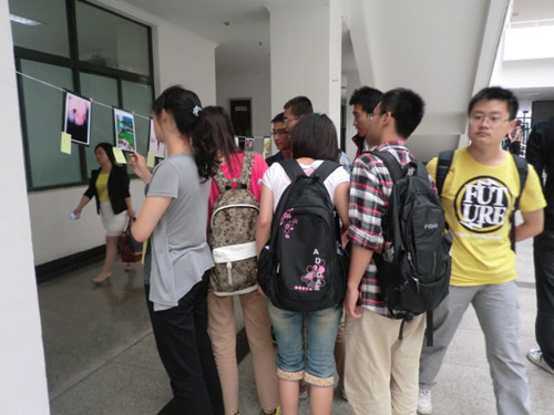(同学们在观看优秀作品展中的摄影作品)