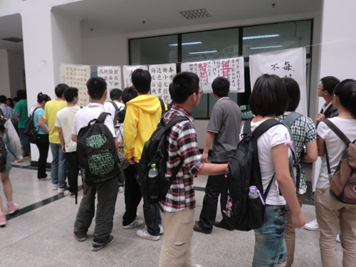 5月11日,文学艺术与传播学院在修远二区大厅举办了大赛优秀作品展。同学们放学后驻足欣赏,期间不时有同学发出赞叹声。“这字写得真漂亮,我回去也要多加练习,明年也来参加这个比赛!”文传学院陈同学如是说。截止到5月19日,展出顺利结束。至此,此次大赛画上了圆满句点。