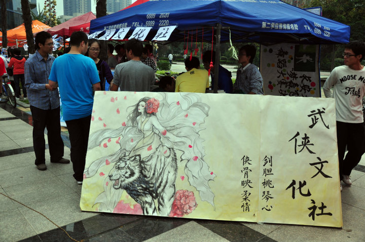 下午三点左右,天空下起了微微细雨。雨滴丝毫没有浇灭纳新的热情,不少新生冒着雨来交报名表,各社团的纳新宣传在雨中依旧红火。相对于校级组织的严谨,学生社团的纳新活动更加活泼生动。Dancing Club 协会在纳新现场表演了热情洋溢的舞蹈。新鲜空气动漫社的成员身着动漫人物的服装,妆容到位,仿佛让人进入动漫的王国。