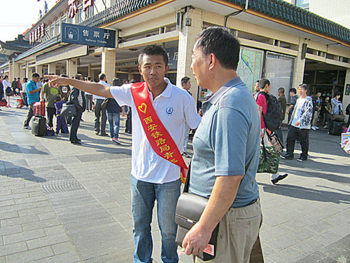 中午1:00,秋日艳阳下,志愿者们在逸夫图书馆门前汇集,整装待发。下午近3:00,全体参与本次火车站志愿服务活动的志愿者到达了岗位,并立刻开始了紧张有序的志愿服务。十一期间,西安火车站到处有着长安大学青年志愿者们奉献的身影。在进站广场,志愿者挥动双手指引迷茫的旅客以明确的方向;在候车大厅,志愿者用温馨的话语安抚焦急的旅客,并耐心地解答旅客们的疑难问题;在各大售票处,志愿者们疏散拥挤混乱的人群,平复归心似箭的旅客们焦躁的心,使购票队伍井然而有序。亲情服务点、移动服务车、网络领票处……长安大学的青年志愿者们以自己的方式诠释着对志愿服务的热忱与忠诚。