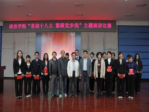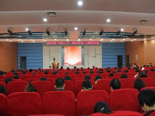 2012年10月28日14:00,我院“喜迎十八大,紧跟党步伐”主题演讲比赛在渭水校区会议中心报告厅成功举办。校团委副书记张永、院党委副书记宋琳、政治学系戴生岐教授、思想品德教研部主任王立洲副教授、院团委书记汪治国出席比赛并担任评委。