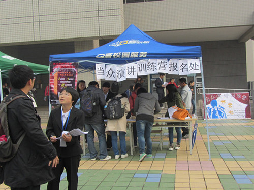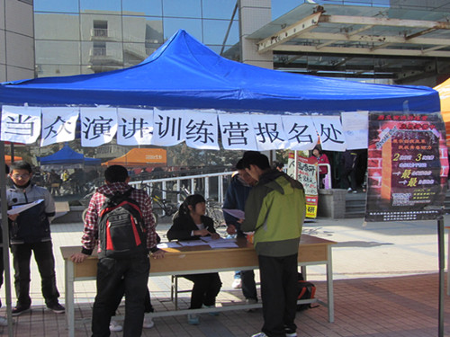 2012~2013学年校心协当众演讲训练营以“展示自我风采,挑战青春魅力”为主题,致力于为校内众多想挑战自己、挖掘自身潜能的同学提供一个提高自身心理素质、展示自信风采的平台。此次活动从宣传工作开始就吸引了广大学子的目光。在为期两天的报名活动中,前来报名点咨询报名的同学络绎不绝,不少同学对训练营形式的演讲培训活动抱有极大的兴趣,并针对活动流程的安排向报名点工作的校心协工作人员进行了详细的咨询。校心协工作人员则耐心的向前来咨询的同学讲解整个活动中的培训和成果展的时间安排和细节事项。报名活动安排在两天的午餐和晚餐时间,广大同学的积极参与和校心协工作人员辛勤认真的工作使报名活动获得了成功。