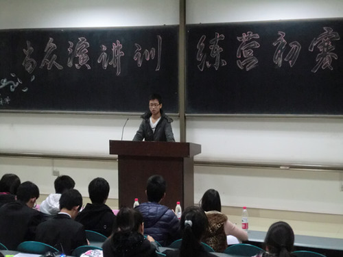 此次当众演讲训练营初赛在图书馆东侧一层1102,1103,1104三个教室中同时进行,选手到达比赛地点后抽签编号并在比赛教室内就座,比赛开始,首先由主持人介绍了本次比赛的规则及注意事项,正式拉开此次当众演讲训练营初赛的序幕。随后,选手按照抽到的编号依次上台进行三分钟的发言。比赛中,各位选手尽情展现了他们张扬的个性,有的抒发对未来的憧憬,有的阐述对选择的认识,有的表达对国家的爱,丰富多样的主题,选手们慷慨激昂的演讲,时常博得现场热烈的掌声。在选手出色的演讲之间,还有评委们精炼的点评,既对他们的出彩之处表达了赞扬与肯定,也针对他们的不足提出了改进建议。比赛最后,由评委上台对整场比赛进行点评,评委的总结为此次初赛画上了圆满的句点。比赛结束后,在工作人员的指引下,在场选手及观众有序离场。