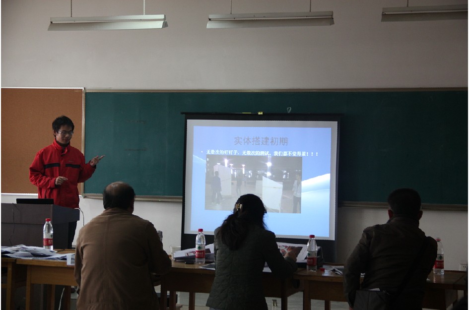2012年11月9日,我院于渭水校区明远3315教室成功举办了长安大学建筑学院第十一届建筑日实体搭建的评审活动,本次活动对第十一届建筑日中来自24各班级的24件作品做出了专业性的评审与打分。出席本次活动的有建筑学院副院长王农、党委副书记史少鹏、团委书记刘鹏以及建筑学院专业老师张彬、张磊、刘乃奇、于汉学、杨宇峤、解学斌和王亚绒以及来自建筑学院12级至09级的各班解说代表等。