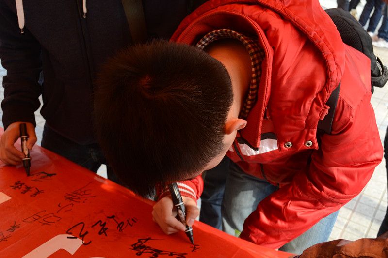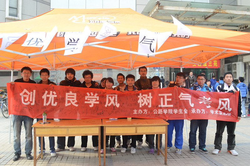 中午放学后,公路学院学生会主席周晓东、学术实践部部长刘彬、以及相关学生会工作人员就早早的来到了活动现场。到食堂吃饭的同学们看到这个活动后都积极主动地来了解活动内容,每个人都坚定着诚信考试的信念,自信、认真地在横幅上写下自己的名字,相信他们一定能做到诚信考试。不一会儿,横幅上就签满了同学们的名字。最后,大家一起举着横幅合影,圆满的结束了这次意义重大的倡议活动。