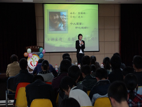 接着,比赛正式开始,此次比赛共分两个环节进行,在第一个环节自由演讲中,12位选手在各自4分钟的演讲时间内,就友情、爱情、大学生活、人生态度等话题进行了精彩的演讲。其中2号选手尹黎题目为 《我的大学》的演讲用幽默的语言为我们描绘了一种理想的大学生活,引起了现场众多观众的共鸣。9号选手张研《宁鸣而死,不默而生》的演讲深刻而独到的阐述了人生态度的重要性,屡次获得观众的热烈掌声。在自由演讲环节中间还穿插了有奖竞答的互动环节,同学们对主持人提出的关于长安大学、校心协、心理知识等问题争相抢答,踊跃参与,现场气氛高涨。
