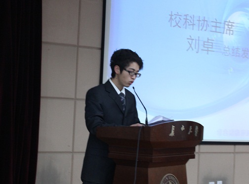 会议伊始,校科协主席刘卓对校科协第一学期工作做工作总结。报告总结了校科协一学期以来所取得的成绩和存在的不足,其中,对第八届“挑战杯”课赛和第十二届“科技节”做了重点汇报,同时对“本科生专利申请现状”以及开展的创新创业活动进行了总结,对现阶段存在的缺点和不足提出指正,以完善日后的工作。