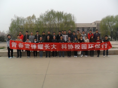 2013年3月16日,为响应团委关于“青春雷锋耀三秦”的倡议,我校大学生科技创新与创业协会(简称“校科协”)的学生干部于当日下午一点在长安大学汽车试验场顺利开展“校园环保行”志愿者活动。参加本次活动的领导有汽车试验场张主任,校科协主席刘卓,副主席田振坡、王孟良,各部门部长及干事。
