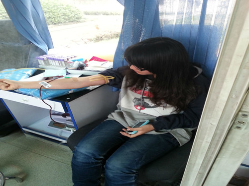 中午12:00,随着中午下课铃声的响起,大量的学生来到采血点,甚至顾不上吃饭和午休,只是想着力所能及地为身处灾难中的雅安贡献自己的一份微薄力量。“刚开始还挺害怕,但我想到这时候的雅安需要大家的帮助,也就不害怕了,”好多女生是第一次献血,因为体质较弱,之前一直没下定决心,但这次她们义无反顾的来到了采血点。据女生们说,她们看到了地震的无情,看到了雅安的眼泪,更看到了祖国人民支援灾区的奋力场景和同学们奉献爱心的积极行动。