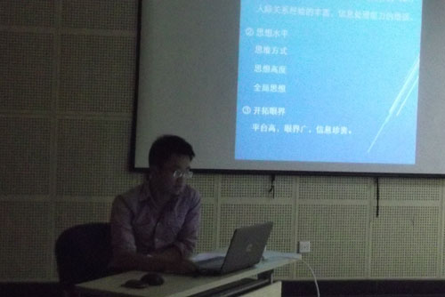 接着,学生会主席李致中就“学生会的改革实践与思考”这一主题为参赛选手进行详细的讲解,其中重点提出了“思考”对学生干部的重要性,并就思考什么,怎样思考等一系列问题进行了深入阐释。