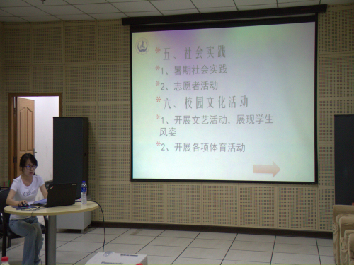 本次会议的主要流程分为参赛选手陈述阶段以及评委点评阶段,陈述阶段参赛选手首先做简短的自我介绍,接着以“学年工作计划”的话题展开陈述,并从自己所要竞选职位的角度出发,详尽的阐释了如果他们成功胜任竞选职位后的工作思路,工作重点以及工作计划。并结合投影仪陈述自己的观点,使其演说更加生动形象,点评阶段评委主要根据参赛选手现场表现以及主要思路和观点给予相关评价。其中校学生会公关部大一干事段晨光,围绕李致中主席经常提到的“三流学生会办活动,二流学生会搞维权,一流学生会引领思想风潮”给出了自己观点,并从而引出自己的核心论点“打造长安大学学生会的品牌”。李致中主席首先为其作为大一干事能有勇气参加本次活动提出表扬,接下来又耐心讲解了他所说的三个级别学生会的含义,大家都受益颇深。