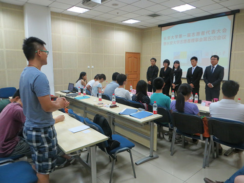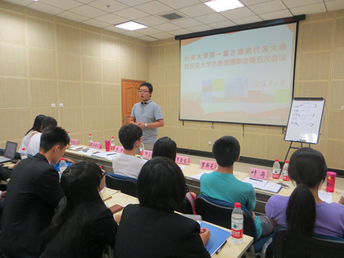 2013年6月14日,朝晖大学生活动中心培训室坐满了来自我校各院志愿团队的优秀志愿者代表。长安大学2013年志愿者代表会议暨长安大学志愿者理事会第五次会议在此顺利召开,并取得圆满成功。大会选举出三名长安大学青年志愿者服务总队主席候选人,他们分别是总队志愿者管理部部长刘航、总队志愿者培训部部长石钰、总队支农支教部部长韩婧。出席本次大会的嘉宾有校团委李瑾老师、校团委邱贞龙老师及长安大学青年志愿者服务队主席团成员。