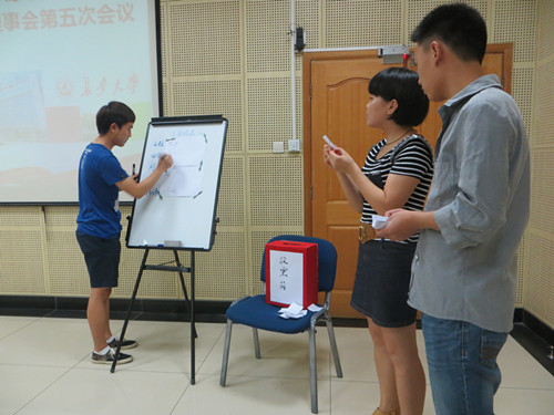 晚19:00,大会正式开始。李瑾老师作为主持人为在座志愿者介绍了换届前期的相关工作,宣布了选举的流程及规则,同时强调以工作思路为重点。随后,竞选演讲由总队公关部部长汪丹的演讲开始进行。接着,其余四位候选人依次进行了竞选演讲。其中,总队办公室部长白锐指出,90后不缺思维,缺的是行动,强调了行动的重要性。在提问环节,各候选人分别就现场志愿者提问进行了回答,加深了志愿者代表对各位候选人工作思路的理解。
