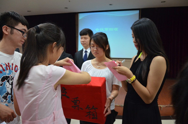 会议初始,由主持人张红老师介绍换届的相关工作,宣布选举的流程与规则。随后, 秉着“公正、公开、公平”原则,4位团长候选人依次发表竞选演说。竞选内容从“家”文化的建设以及“第二课堂”的重要性与“雅俗共赏”的节目规划等方面展开。他们精彩的表现获得了与会代表的热烈掌声。提问环节中,各候选人就与会代表的提问进行了回答,加深了大家对各位候选人工作思路的理解。会议投票阶段,66名与会代表根据候选者的竞职表现,进行了无记名投票。