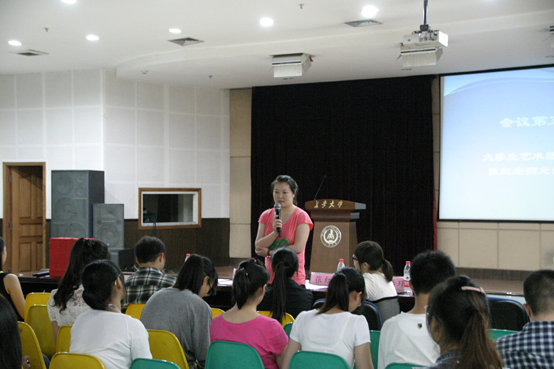 投票结束后,大学生艺术团秘书长张红老师做出总结发言。她指出在校园文化建设方面大学生艺术团作出了重要贡献,秉承了“弘扬民族文化、倡导高雅艺术”的宗旨。她强调大学生艺术团各部门应当紧密联系,以服务大家的心态面对今后的工作,强调了“家”文化的重要性。此外,张红老师对新一届大艺团提出了新期望,应当继续发扬优良作风,加强艺术建设,为把大学生艺术团建设成高校一流艺术团体而不懈奋斗。