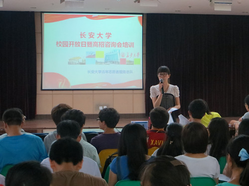 2013年6月24日,长安大学青年志愿者服务总队在我校大学生活动中心多功能厅召开了长安大学校园开放日暨高校咨询会志愿者培训会。本次培训会邀请到校团委李瑾老师对志愿者们进行培训,校园开放日的80名志愿者全部到场参与了此次培训会。