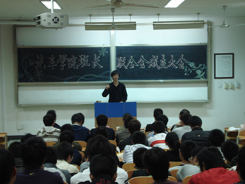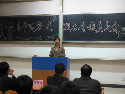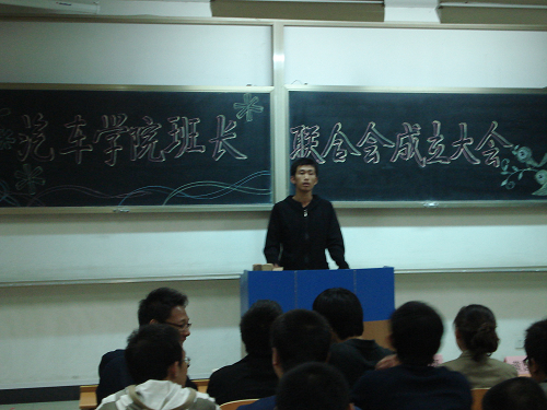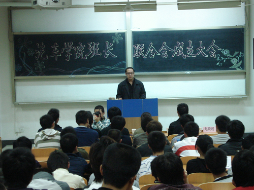 2009年10月15日晚,长安大学汽车学院班长联合会成立大会在渭水校区圆满召开。汽车学院团委副书记郭咏梅老师、汽车学院09级辅导员黄国潮老师及汽车学院学生会主席团成员出席成立大会并对班长联合会的成立表示衷心的祝贺。