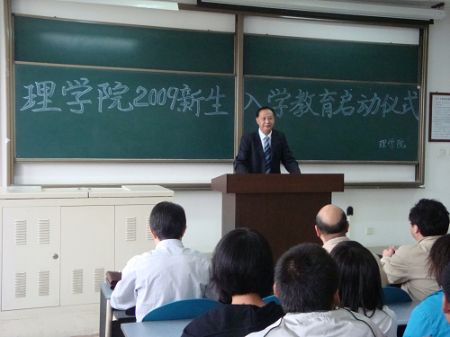 9月20日上午九时许,长安大学理学院于明远1402隆重举行理学院2009级新生入学教育启动仪式。莅临仪式现场的领导、老师有理学院党委书记胡予欣,党委副书记姜洪,副院长龚伟,副院长刘建民,副院长王虎,院办公室主任赫锦如,工程力学系副主任王爱琴、张新占,院团委书记汤颖颖老师,各系老师代表及辅导员朱小军老师。理学院09级全体新生更是以饱满的热情接受入学启蒙教育。整场仪式由姜洪副书记主持。