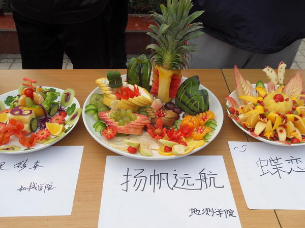 此次水果拼盘大赛既体现了饮食文化节的主题,又培养了学生的动手能力、审美情趣,让学生感受到另一个更健康的饮食习惯。