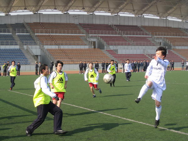 上午10:10,在一声清脆的哨音中,足球赛正式开始。在上半场的比赛中,双方队员迈着灵活的步法不断的穿梭在球场的各个方位,各种攻守方式层出不穷,比赛进行的非常激烈,火热的场面吸引了众多同学前来观看、助威。在中场休息时,拉拉队表演了精彩的舞蹈,使得各位球员得到了短暂的放松。在下半场的比赛中,双方的对抗更加激烈,将比赛一次又一次的推向高潮。但是由于双方实力之间的悬殊,我院足球队渐渐不敌,最终,电控学院赢得了此次比赛的胜利。