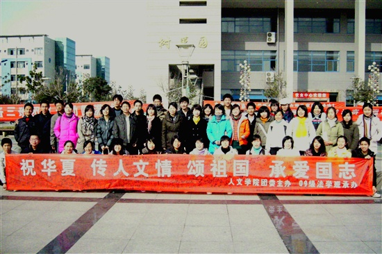 11月20日中午,由人文学院主办,09级法学班承办的“我爱我的祖国”横幅签名活动在树蕙园广场如火如荼地展开。