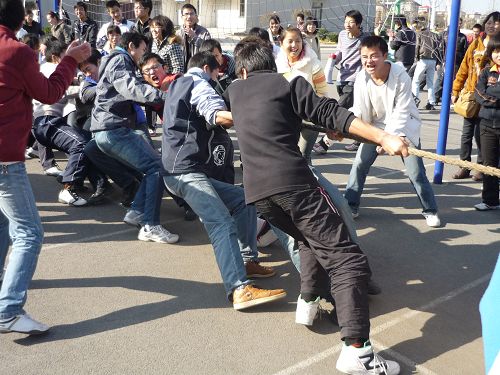 比赛前,各个班级积极备战,确定上场人员、班级口号,并不时发出“我们一定会赢”的自信声。接着比赛正式开始,在一声哨响中,比赛双方开始在各自的口号中,用力后拉,每一小步的后退,都是一次全力以赴的冲击,更增加了一份自信。比赛双方都不甘示弱,哨声未响决不放弃。现场啦啦队也随着比赛的进行,用不断的加油声为场上队员加油。在一声哨响后,比赛结束,现场依旧沉浸在热闹活跃的气氛中。