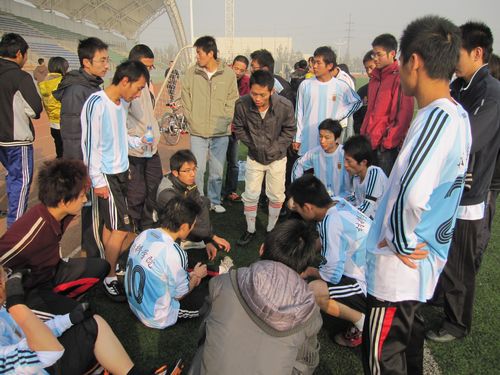 由于天气较冷,赛前球员们认真进行了加速跑、高抬腿等热身运动,以使自己提早进入比赛状态。比赛开始后,材料学院队员们主动进攻,顽强防守,通过积极的跑动和有效的抢位,使自己全场比赛都处于有利的地位。现场材料学院啦啦队更是通过一致的口号来为场上队员加油。最终材料学院和经管学院以3:3的比分握手言和,至此材料学院顺利结束了我校本次足球赛的全部比赛。