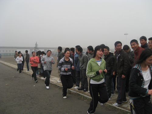 比赛首先进行的是男子组五千米长跑比赛,来自大一、大二的共40名同学报名参赛。比赛一开始,12号选手李传平便一马当先,颇具专业运动员风范的他身着短衣一路领跑,但最终由于爆发力不足而第三个冲过终点,第一名则被24号选手王军夺得。接下来进行的是女子组三千米比赛,来自08、09的共30名同学报名参赛。现场的气氛也在此时涌向高潮,周围的观众奋力的呐喊,更有的同学在旁跟跑,为她们加油鼓劲。最终,1号选手刘静凭借过人的实力摘得桂冠。