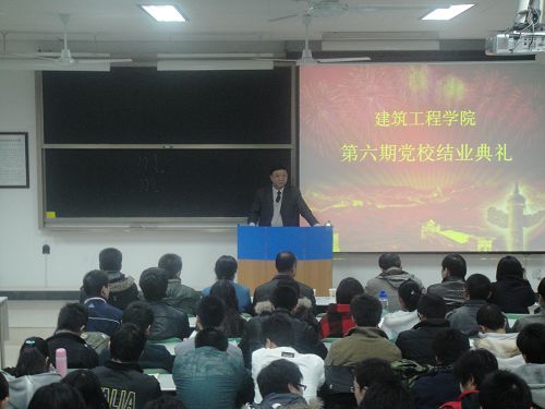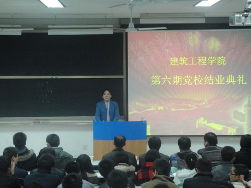 2009年12月15日,建工学院第六期党校结业典礼在修远4304教室隆重举行。出席结业典礼的领导有长安大学党校常务副校长宋美红,建工学院党委书记刘青云,党委副书记刘世良,学办主任李险峰,团委副书记黄小乐等老师。结业典礼由建工学院团委书记王树莹老师主持。