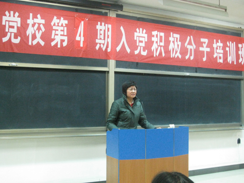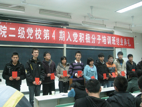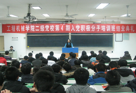 2009年12月24晚7点,工程机械学院二级党校第四期入党积极分子培训班结业典礼在修远4303隆重召开。出席典礼的领导嘉宾有:长安大学党校常务副校长宋美红老师、工程机械学院党委书记刘晓婷老师、党委副书记杨密侠老师、党委副书记曾力老师、工程机械学院学办副主任程宝虔老师、工程机械学院团委书记朱武威老师、团委副书记刘飞老师以及各年级的辅导员老师。结业典礼由党委副书记曾力老师主持。