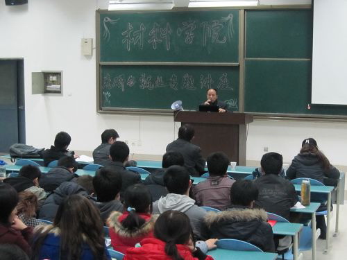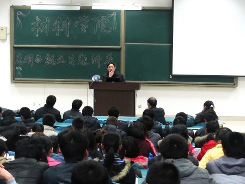 为了解答材料学院学生关于考研与就业方面的困惑,同时使大家更加明确自己的目标,材料学院于3月9日晚在明远3201教室举行了考研与就业专题讲座。材料学院党委副书记高雁北老师、副院长刘开平教授在团委书记何红娟老师、副书记杨树老师和09级辅导员吕志胜老师的陪同下亲临讲座现场。讲座由何老师主持。
