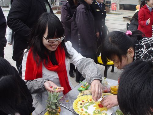 本次女生节系列活动共有三个项目:七彩风车送祝福、水果王国——水果拼盘及“悄悄遇见你”贺卡赠送活动,每个项目都极具趣味,富有特色。在“七彩风车送祝福”活动的现场,女生们在风车的四瓣上写上自己的心愿,男生们则写下自己对女生的祝福。只一会儿,宣传板上就贴满了五彩的风车,并拼成两个大大的心形,吸引了过往男女生们纷纷地驻足观看。下午进行的水果拼盘大赛也是精彩纷呈,16个参赛队的选手们胸有成竹,运用层出不穷的创意和娴熟精确的雕刻技巧迅速展开了激烈的竞争。半小时后,一个个精美的作品就展现在观众面前,真诚表达了对女生们的美好祝愿。最后的“悄悄遇见你”贺卡赠送活动主要参赛对象为男生,以班级为单位进行。活动中,男生亲手为女生制作了贺卡,并送上节日的祝福。