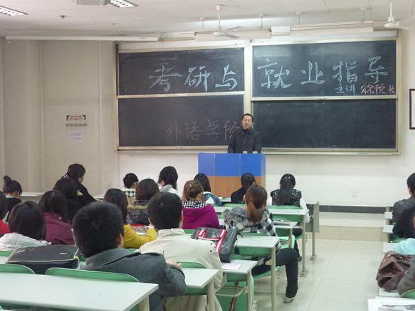 为了使我院07级本科毕业生面对考研与就业有正确的认识,做出理性的选择,3月16日,外语学院院长徐玉臣莅临渭水,在修远2104教室召开了考研与就业指导大会,外语学院党委副书记路志军,团委书记石松,辅导员张秋霞与07级全体本科生参加了会议。
