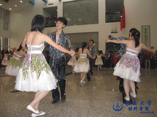 在动感舞曲的伴奏下,材料学院的表演队员身着靓丽时尚的服装,精神饱满地开始了体育舞蹈的表演。他们优美矫健的动作得到了现场同学的阵阵掌声,将现场氛围一次次推向了高潮。