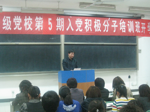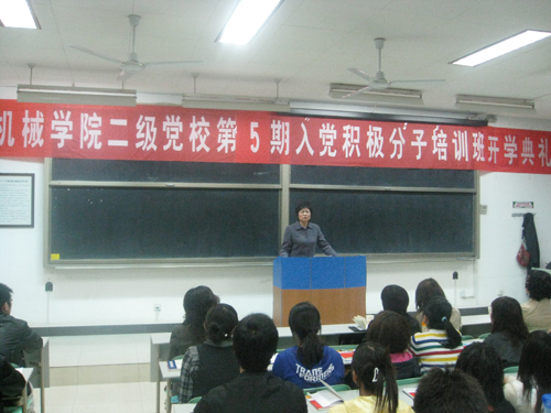 2010年4月8日晚,长安大学工程机械学院二级党校第五期入党积极分子培训班开学典礼在渭水校区修远4304教室举行。长安大学党校常务副校长宋美红、工程机械学院党委书记刘晓婷、工程机械学院党委副书记杨密侠、工程机械学院学办副主任程宝虔以及各个年级的辅导员老师出席典礼。典礼由工程机械学院党委副书记杨密侠主持。