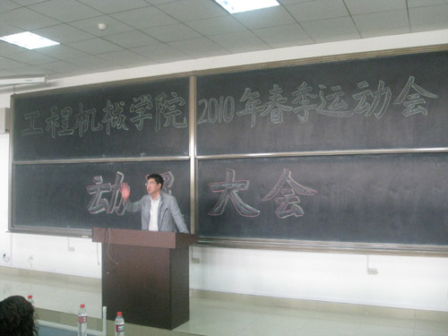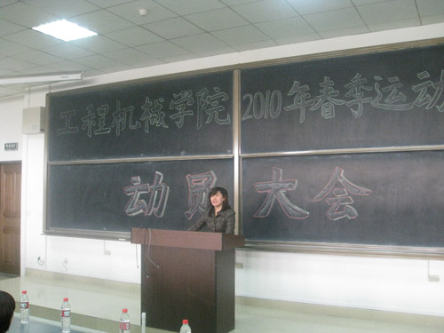 2010年4月9日中午12点20分,工程机械学院2010年春季运动会动员大会在图书馆东侧1201教室隆重召开。莅临此次大会的领导嘉宾有工程机械学院党委副书记杨密侠、工程机械学院学办副主任程宝虔、工程机械学院团委书记朱武威、团委副书记刘飞以及各年级的辅导员老师。参加此次大会的还有工程机械学院团委学生会的学生干部、各班班长以及所有的参赛运动员。