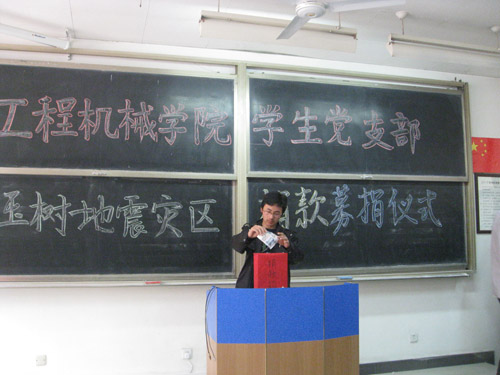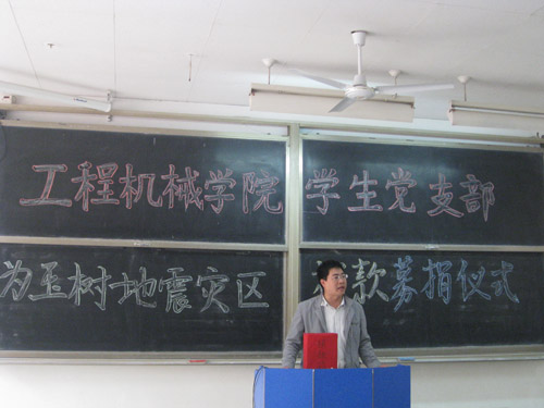2010年4月19日中午12:30,工程机械学院党支部在修远2102教室举行了为玉树地震灾区捐款的募捐仪式。本次募捐仪式旨在响应上级党组织号召,为玉树受灾地区伸出援助之手、献上一份爱心。参加募捐仪式的,有工程机械学院学办副主任程宝虔、团委书记朱武威、团委副书记刘飞、各年级辅导员以及学院党支部全体党员。