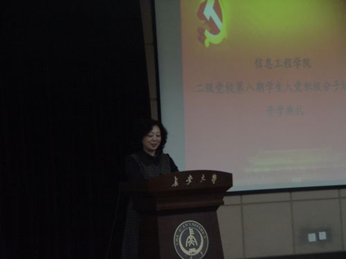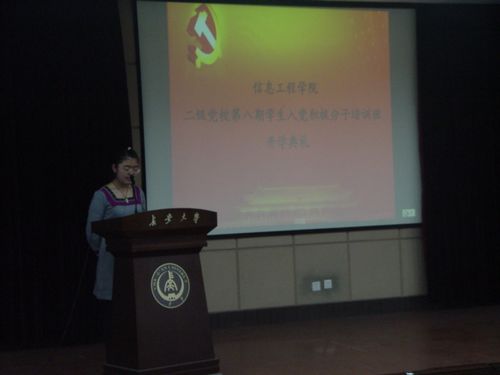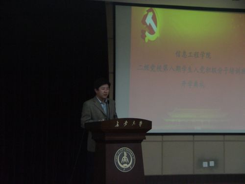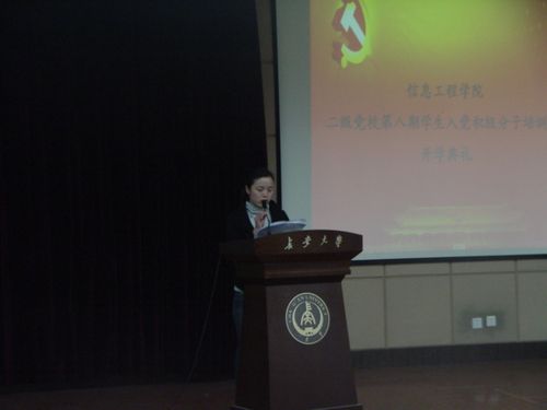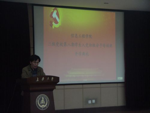 2010年4月19日下午6:30,信息工程学院在渭水大学生活动中心三楼多功能厅举行了信息工程学院二级党校第八期学生入党积极分子培训班开学典礼。出席典礼的有长安大学党校常务副校长宋美红老师、我院党委副书记贺炳彦老师、学生工作办公室主任陈晏老师、院团委书记赵建彬老师、09级辅导员兼本次党校培训班班主任李文敏老师,各学生党支部副书记、支部委员、党小组组长以及本期党校培训班全体学员。会议由赵建彬老师主持。