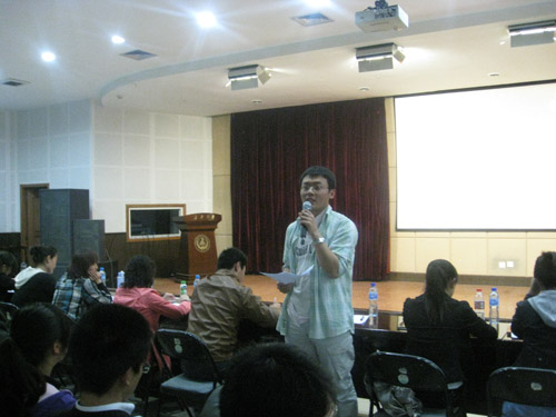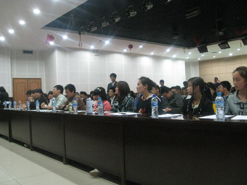 7点整,比赛准时开始,担任此次比赛评委的有公路学院09级辅导员蒋学猛老师,政治学院、地测学院、公路学院、外国语学院、经管学院、建工学院、汽车学院、电控学院以及工程机械学院的文艺部部长。出席比赛的嘉宾有地测学院09级辅导员刘超老师,建工学院09级辅导员谢尚佑老师、索源老师,汽车学院09级辅导员黄国潮老师,政治学院09级辅导员宋典老师及环工学院09级辅导员陈洁老师。
