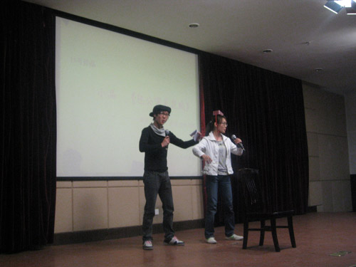 主持人宣读评分细则及奖项设置后,活动正式进入比赛环节,参赛选手依次上台为现场观众献上精彩的表演,他们的作品大都贴近同学们的日常生活,或根据人们耳熟能详的经典桥段进行改编,或以自己的亲身经历为蓝本进行原创,还有的更借鉴网络上流传的搞笑视频进行演绎,引得现场笑声连连,掌声不断。节目中每告一段落就会有评委点评,他们态度谦虚、语气中肯,在帮助选手指出不足的同时,也对他们当晚的表现给予了充分肯定。