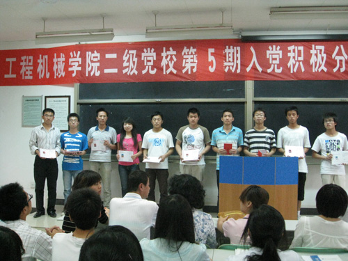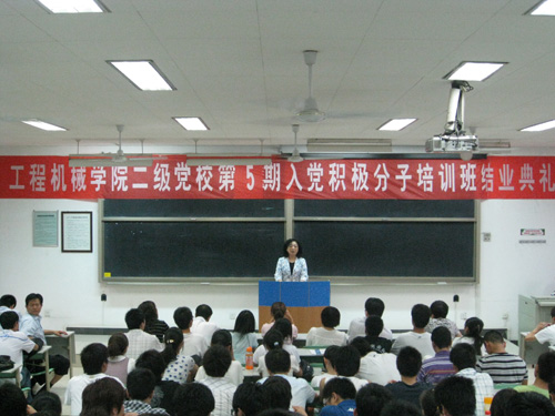 2010年5月25日19时,工程机械学院二级党校第五期入党积极分子培训班结业典礼在修远4303教室隆重举行。党校常务副校长宋美红老师、学院党委书记刘晓婷老师、学院党委副书记曾力、杨密侠老师、学院学办主任程宝虔老师、学院团委书记朱武威老师及学院各年级级辅导员出席了典礼。此次典礼由学院党副委书记杨密侠老师主持。