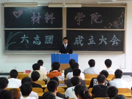 为积极响应校团委的号召,同时更好地发扬材料学院同学的志愿服务精神和奉献精神,5月27日晚,材料学院于修远1104教室隆重举行大学生志愿者服务团 (以下简称“大志团”)成立大会。材料学院党委副书记高雁北老师、我校团委朱先前老师应邀出席了本次会议;材料学院团委书记何红娟老师、副书记杨树老师也参加了本次大会,同时参加会议的还有我校青年志愿者服务总队主席汪托同学和各兄弟学院大志团团长及材料学院学生会、科技创新与技术协会、彩虹心理协会主席团成员和各班学生代表。会议由大志团宣传部杨贵琳同学主持。